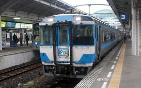 (左:坂出に到着する3131Mマリンライナー11号、右:高松駅での1000系気動車) 坂出に到着する頃は、さらに豪雨になった。別に雨が降ってもどうということはないが、あまり気分の良いものではない。3131Mは定刻9時16分に高松に到着する。到着直前にこれから乗る185系ゆうゆうアンパンマンカー連結車と併走した。 10月29日(土)高松〜徳島間65D特急うずしお5号 高松に到着すると、雨は小降りになった。ここでは、まず1000系気動車につけられているであろうヘッドマークの確認をする。アンパンマンヘッドマークは、松山では松山、高松、高知の3種類を見ることができる。それによって、車両の所在地がよく判るので重宝したほどである。が、松山では決して徳島所属の車両を見ることがない。が、初めて見ることができた。案の定青いヘッドマークであった。JR四国が後援する野球の四国独立リーグのチーム名そのものの色であった。要するに徳島の場合は「インディゴ」ブルーだから青色なのだろう。もっとも、愛媛「マンダリン」のオレンジと香川「オリーブ」のグリーンは判るが、高知「ファイティングドッグ」の赤は理解に苦しむ。「ファイト」と「ファイヤー」を混同してないか?まあ、いいけど。 さて、次に今日はここで最大の交渉をしなければならない。実はこの後、うずしお5号〜剣山5号と乗り継ぐのであるが、この2列車は185系気動車でゆうゆうアンパンマンカーを連結している。この車両は、今年2月に剣山10号で経験済みであるが、今回は2列車で合計2時間半近くの乗車を予定していた。が、なんと、うずしお5号の方は1ヶ月前から全車満席になってる。普通ありえない話だから、旅行会社経由の団体予約と考えられる。とりあえず、1号車の指定席券を所持しているが、規則上は2号車の指定席券を購入しない限り、ゆうゆうアンパンマンカーで遊ぶことはできない。ここは、車掌に交渉するしかない。というわけで、車掌に話しかけてみたのであるが、意外にも、あっさりと了解された。さらに、1号車にいた他の子供連れの乗客にも2号車へ来るよう勧めていた。大変柔軟な対応に感謝する次第である。で、当の団体とはどのような人たちなのであろうか。子連れの団体も考えにくいし、といって大人の団体ならば不気味である。 ゆうゆうアンパンマンカーへの立入は許されたが、当然2号車の指定席券を持っているわけではない。そのうち、なんだかわからんうちに複数の親子連れで車内がいっぱいになった。しかも、単独の団体客というわけではなさそうだ。あとでわかったことだが、徳島駅では3組の団体の出迎えをしていた。つまり、どこかの旅行会社が独自にそういう親子連れを募集して企画したのではないか?そんな気がした。それが証拠に、次の剣山にも引き続き乗車をした親子連れが数組いた。 (左:高松駅での65D特急うずしお5号【拡大可】、右:65Dゆうゆうアンパンマンカーの車内) さて、65Dは高松駅を出発すると、市内をぐるりとまわって屋島へと向かう。現在のコトデン志度線開業が明治44年11月18日、長尾線開業が明治45年4月30日であるから、国鉄が大正14年8月1日に現在の高松〜志度間が開通するよりも早かったわけである。JR栗林駅は以外にコトデン瓦町とは近いが、高松市の繁華街をかすめてお茶を濁しているという感じがする。このあたり、松山や高知なども同じような傾向にあるような気がする。それにしても、今地図を見て気付いたのだが、今や高松市は徳島県と直接接しているのにはびっくりした。 志度を過ぎると、JRは急に進路を南へと向ける。次に海に出るのは讃岐津田なのだが、この間は県西部の仁尾ほどではないが、結構海側に山が連なっている。ただ、国道はほぼまっすぐに突っ切っている。この辺りはつかみ所がないように山が広がっているのだが、地図で志度と讃岐津田の間の山中をよく見ると、よくもこんな山に囲まれた狭隘な場所をと思う所を、鴨部川が流れている。つまり、志度から讃岐津田に行くには、峠を越えて鴨部川に出て、さらに峠を越えて讃岐津田に出ることになる。しかも、この鴨部川は上流になれば平野が広がり、その中に造田や長尾線の終点長尾まであり、なんと徳島県境近くから流れ出ていることが判る。というわけで、造田と長尾は同じ平野の中にあって結構近いということも判る。コトデン長尾線の終着駅から造田までは乗換駅としては少々遠いが、タクシーを使えばかなり近いのだろう。 (造田付近の地図はこちらへ) > 国土地理院の地図へ >> 結論として、JRは志度から幸田池を目指して鴨部川流域に出て、さらに、ほとんど分水嶺もない神前付近で今度は津田川へと出るという手段を選んでいる。この発想が現在幸田池付近の四鉄不動産を抱えるオレンジタウンとして発展している。ちなみに、造田の北側にある山は石鎚山といい、標高198・1メートル。愛媛県の最高峰石鎚山(標高1982メートル、30年ほど前までは1981メートル)のほとんど10分の1というのが