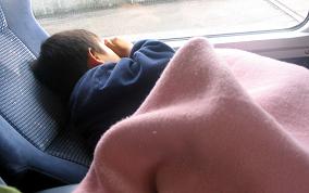 (左:宇多津駅に進入する13M、右:13Mで熟睡するかずまる) などと考えている内に列車は多度津を通過する。あと1時間もすれば午後の「SL急行義経号」がやってくるせいか、ホームや線路脇にずらっと三脚が並んでいる。13時50分に宇多津へ到着する。朝6Mで見かけた雨中のホームで撮影していたマニアと見受けられる方々が、まだ待機していた。 10月29日(土)宇多津〜松山間13M特急しおかぜ13号 いよいよ、今日の最終ランナーである。が、昨日も、そして明日も乗車する区間でもあり、私も終始寝ていた。そして、それ以上にかずまるは松山駅まで寝ていた。まあ、ゆうゆうアンパンマンカーであれほど騒いだのだから仕方はないか。 さて、この13Mが20分以上遅れた場合は、その後の坊っちゃん列車に乗車できなくなり、週末連続乗車記録が途絶える。今年3月に宣言したとおり、実際には記録を一度途絶えさせるつもりでいるのだが、ここまでくると、何か外的要因が欲しい。というわけで、今日の13Mあたりが事故かなにかで遅れくれないだろうか、などと考えていたりしていたのだが、そういうときには遅れたりしないものだ。今日も13Mはほぼ定刻に松山駅へ到着した。このまま坊っちゃん列車の乗ってから帰り、最終日の明日は午前7時過ぎにJR松山駅へやってきて、8Mに乗車する予定である。(2005.11.09) |